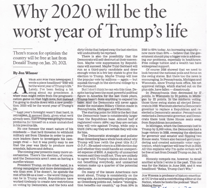 A year ago, I wrote a piece headlined “2019 will be the worst year of Trump’s life.” Lately, I’ve been feeling a bit smug about my prescience. A wiser man might retire from the prognostication game on that high note, but instead I’m going to double down with a new prediction: 2020 will be the worst year of Trump’s life.
