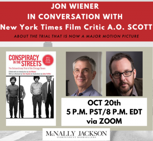 New York Times film critic A.O. Scott discusses the Aaron Sorkin film, “Trial of the Chicago 7,” and the book “Conspiracy in the Streets,” at an online event hosted by the McNally Jackson Bookstore of Brooklyn.